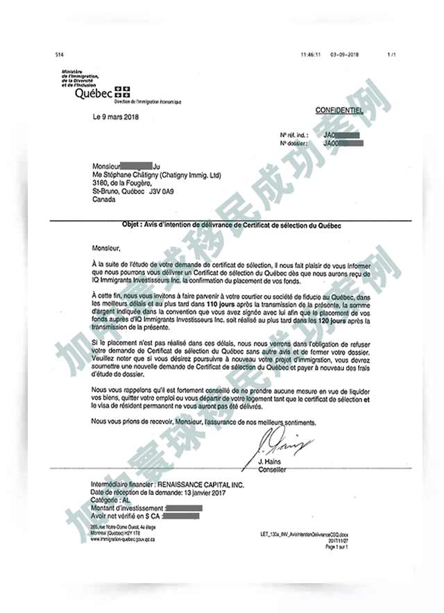 L先生 收到CSQ(魁北克投資移民項(xiàng)目)