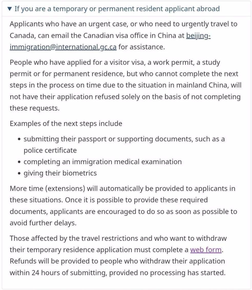 對于正在申請加拿大的旅游簽證、工作簽證、學習簽證或者永久居民的人們來說,正在審理中,但因中國的疫情無法按時完成下一步申請的(比如客戶無法完成生物采集等),將不會因為簽證申請沒有完成而被拒簽。