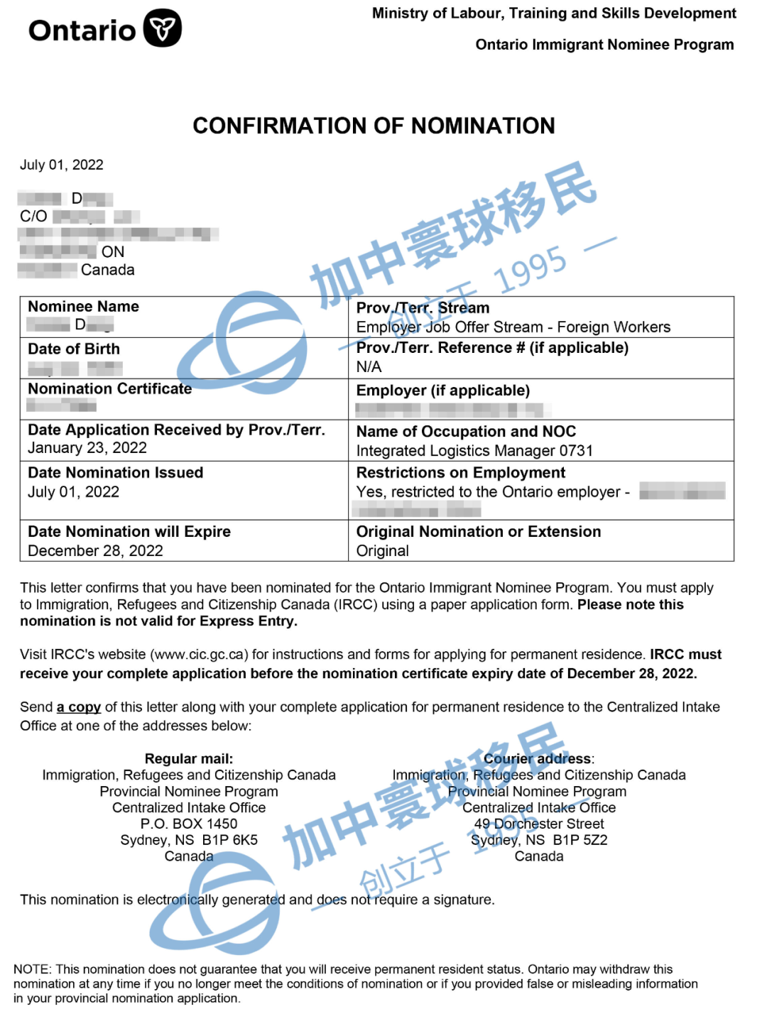 加中寰球客戶D女士(綜合物流經理)申請安省雇主擔保移民,省提名于2022年7月1日成功獲批。有關詳情如下: